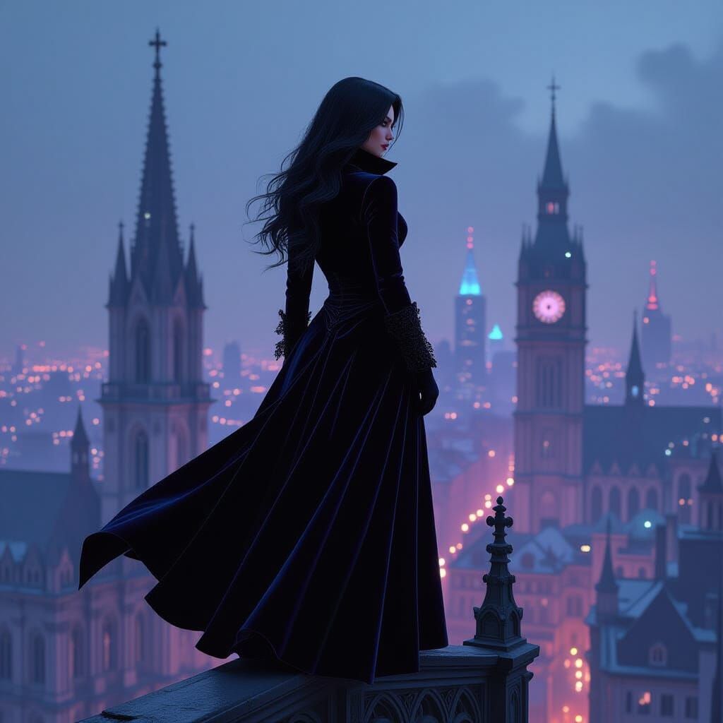 A goth superheroine observes a neon city from a cathedral. The image evokes romanticism and mystical symbolism, rendered with a vibrant, avant-garde aesthetic.