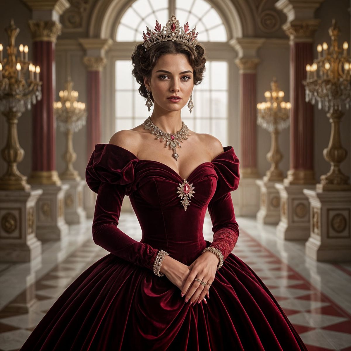 This hyperrealistic image showcases a stunning woman, the Crimson Queen, adorned in an intricate dress and jewelry, set against a detailed backdrop.