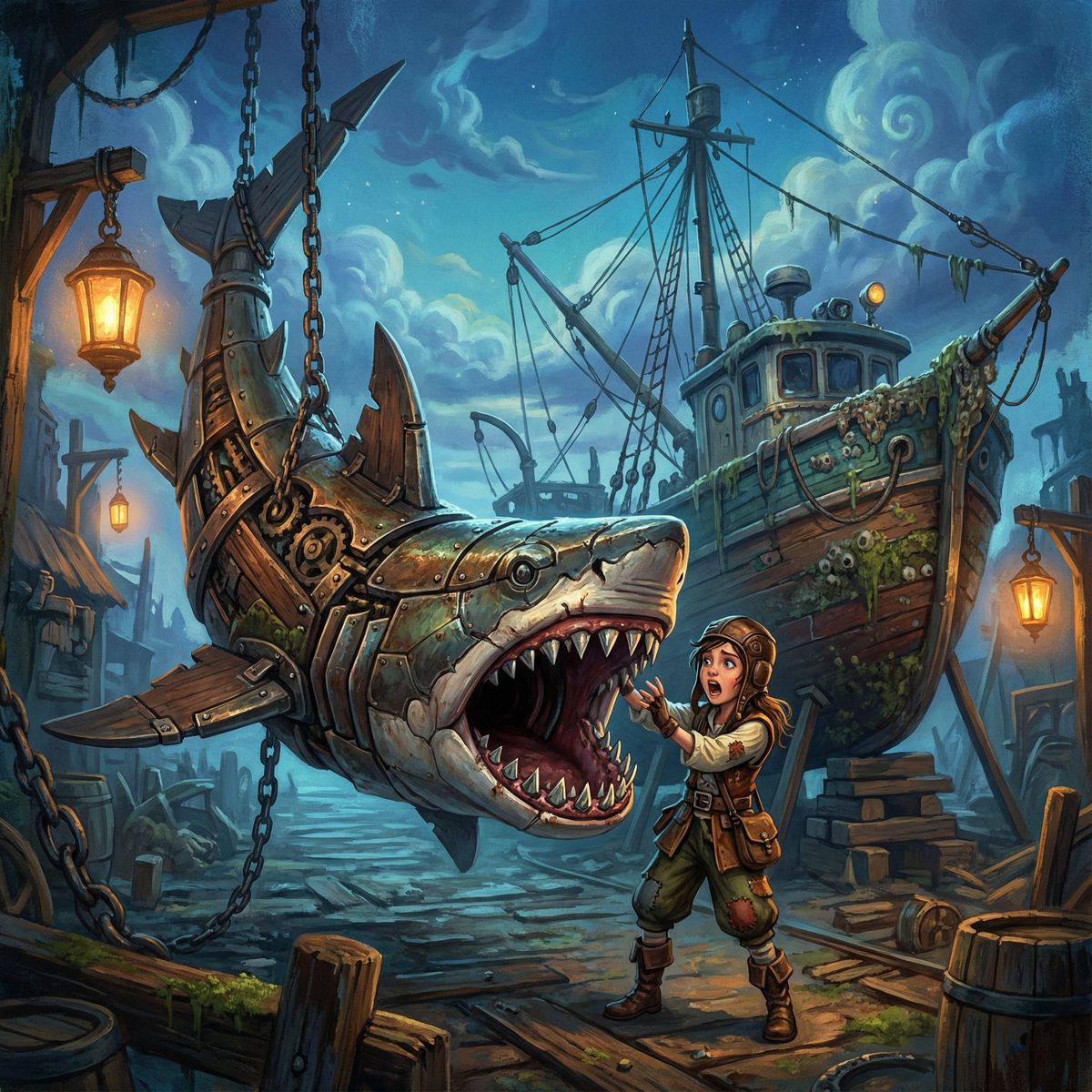 An artificial 8 foot shark, hanging by his tail. It's mouth is open wide. This shark is changing in front of a fishing boat. This boat is sitting, dry docked. A young girl acts like she puts her head in the sharks mouth, with fear in her face as though th shark is going to bite her.