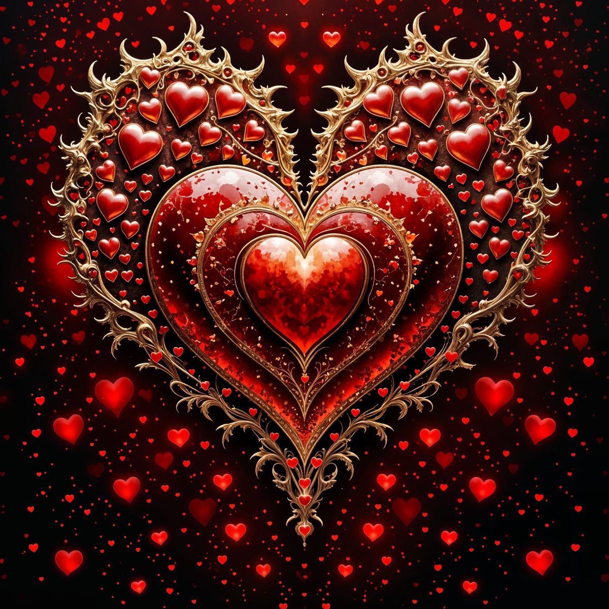 This image displays a fractal pattern filled with red hearts, shimmering in gold and red hues. It features glowing particles and volumetric lighting, evoking surrealism and visionary art.