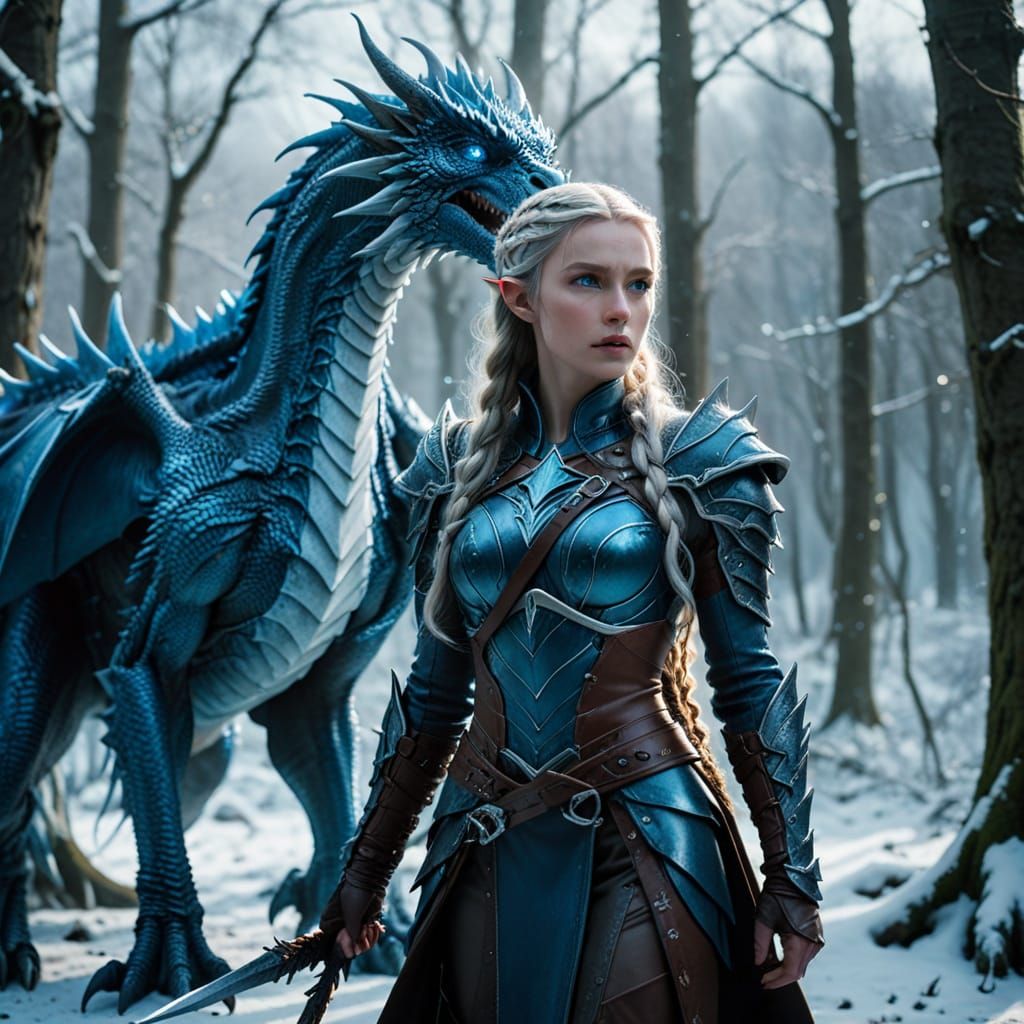 A striking picture of an elven huntress in a snow-covered forest. An ice dragon is coiled around the armored woman, her glowing blue eyes scanning the horizon. Captured as a cinematic film still.