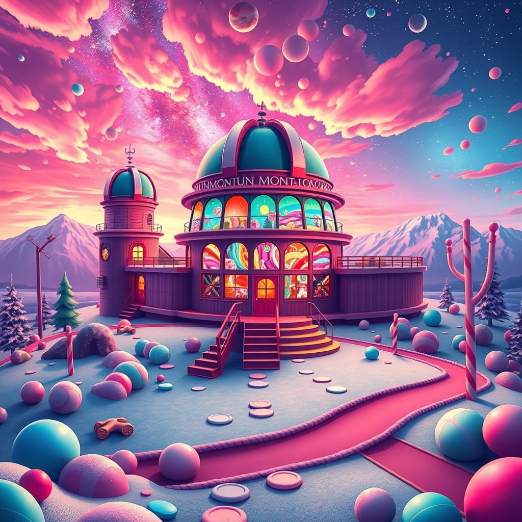 This image shows the Mont-Mégantic observatory center rendered in a whimsical candy art style. The digital illustration features dynamic lighting and ray tracing reflections, creating a vibrant and playful scene.