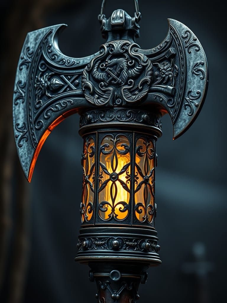 This image shows a detailed, photorealistic Viking axe transformed into a lantern. Volumetric lighting and complementary colors enhance the cinematic and atmospheric quality in a digital matte painting style.