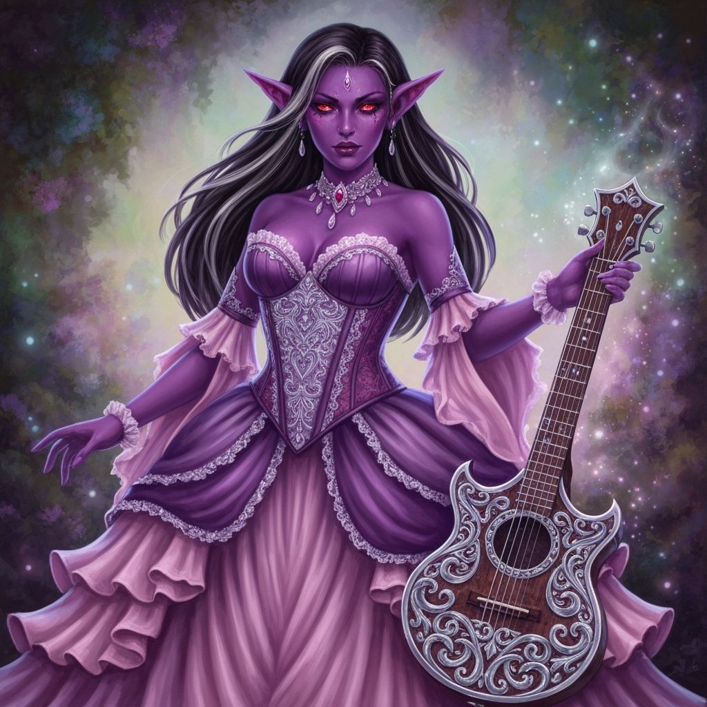 A striking picture of a drow bard with plum skin and red eyes. She wears a lavish, baroque-inspired outfit of purple, pink, and silver, and holds an ornate guitar in this vibrant, dreamlike scene.