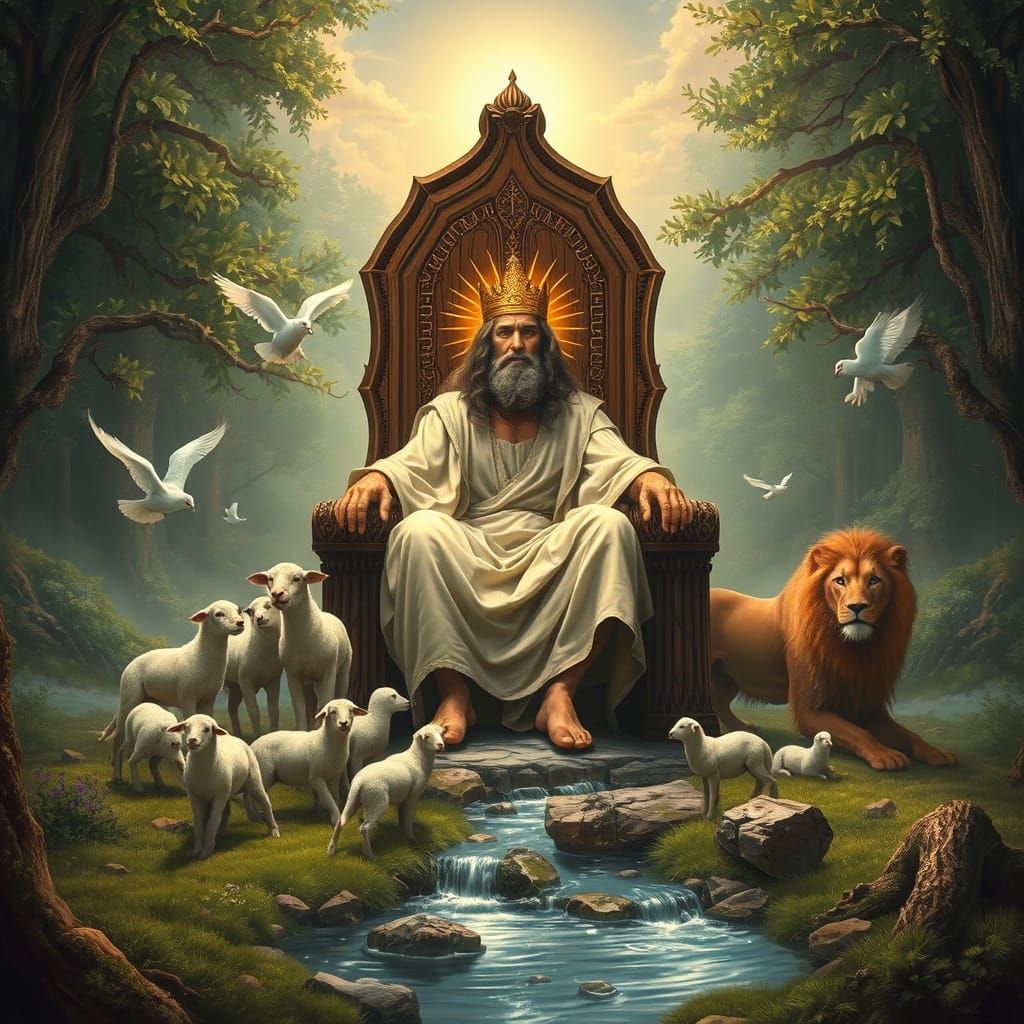A serene image of a divine Shepherd-King on a wooden throne in an eternal garden. The artwork evokes a detailed matte painting style, depicting a peaceful scene with flowing rivers of life.