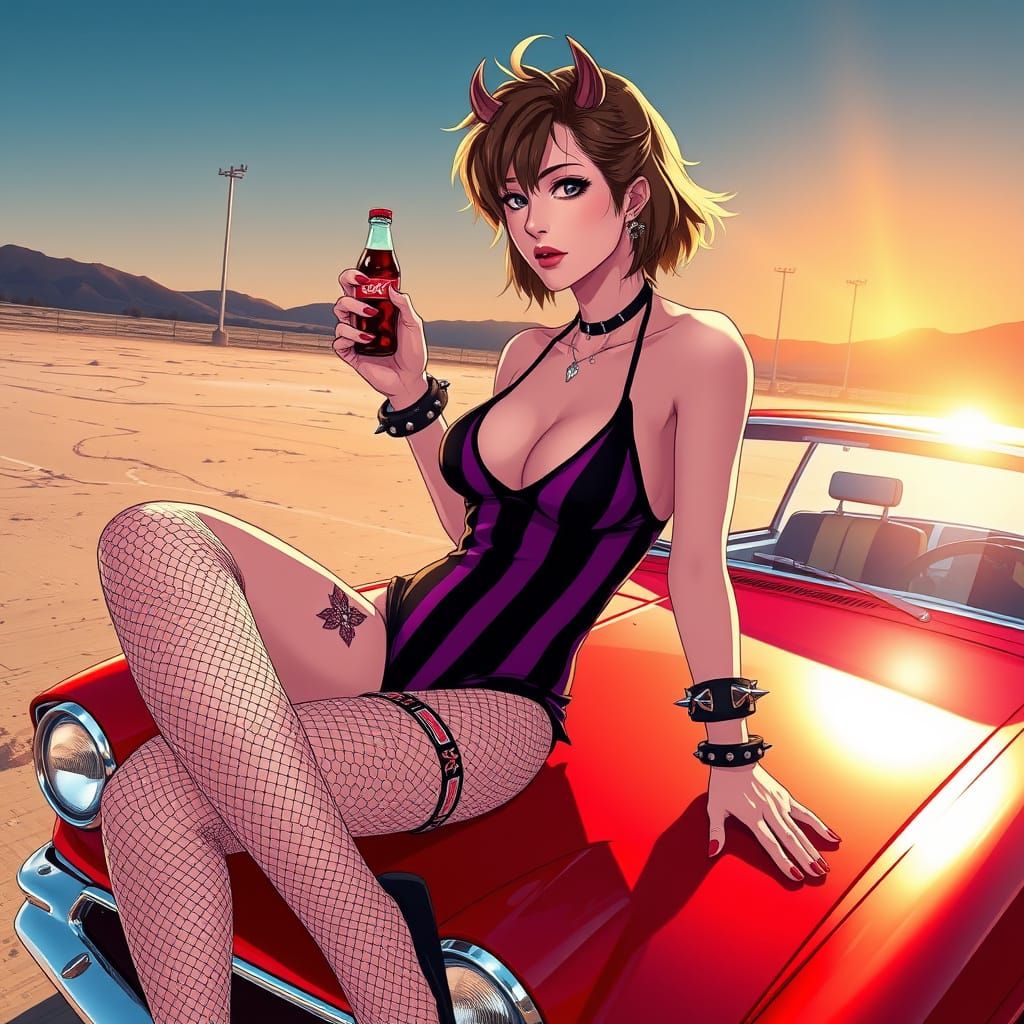This vibrant anime artwork features a young emo woman lounging on a classic sports car, adorned in a bold striped swimsuit and fishnet stockings, with small horns and a tattoo, set against a golden morning light with long shadows, and a glass bottle of cola in hand.