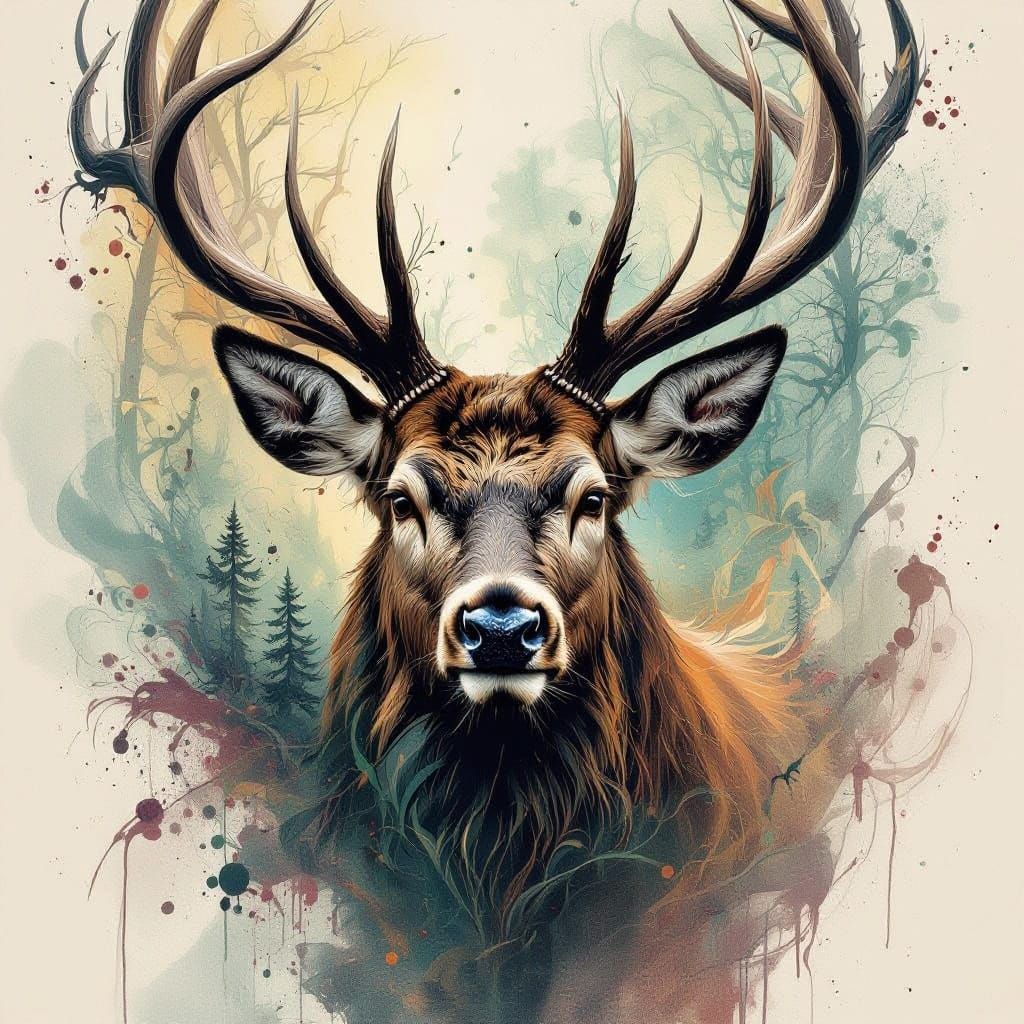 Portrait a Stag Genuine Stag portrait of Mysterious Stag swirling forest !! :: breathtaking Stag cover art Artwork, perfect 32 k by 88, Jon Foster, Carne Griffiths, Camilla D'Errico, Jean Baptiste Monge, Guweiz, insanely detailed, speedpaint with large brush strokes and paint splatter, triadic colours, ...