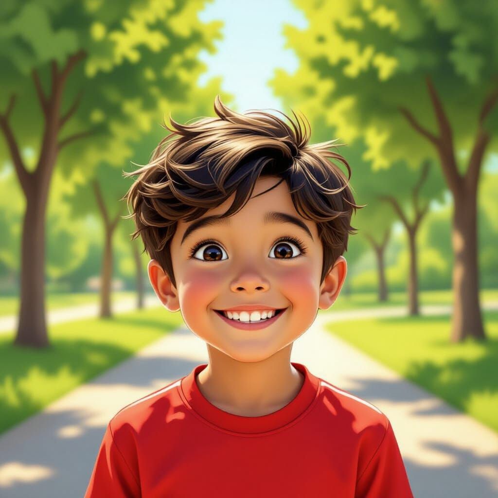 This illustration shows a happy boy in a red sports jersey smiling outdoors on a sunny day. Dynamic lighting and a warm palette capture his playful spirit.
