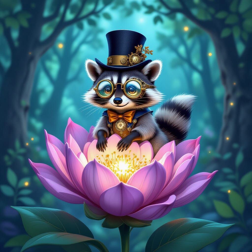 A detailed steampunk illustration of a raccoon in a top hat and goggles on a giant, glowing lilac flower. Set in an enchanted forest with bioluminescent leaves and nebulae-filled sky.