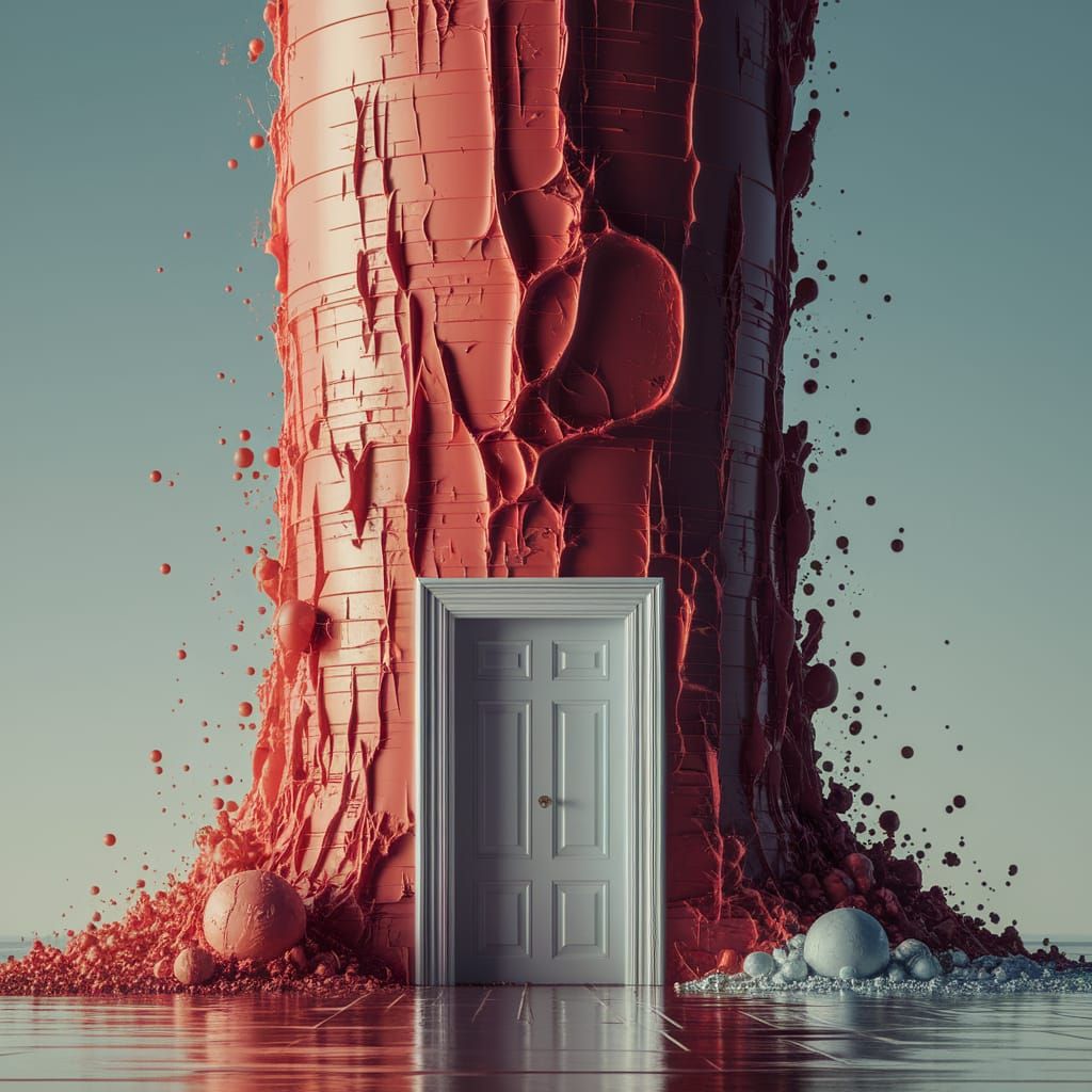 This image shows a double exposure of a skyscraper with a miniature door at its base. The artwork is reminiscent of gouache and watercolor paintings, with thick brush strokes and impasto textures.