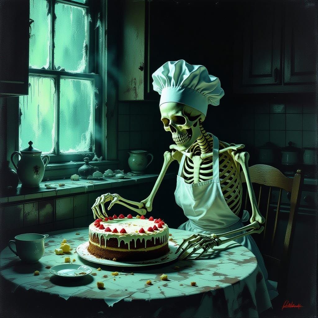 This image depicts a macabre scene in a haunted kitchen, featuring a skeleton in a baker's attire reaching for a decaying birthday cake. Rendered in a dark, gothic art style with dramatic lighting.