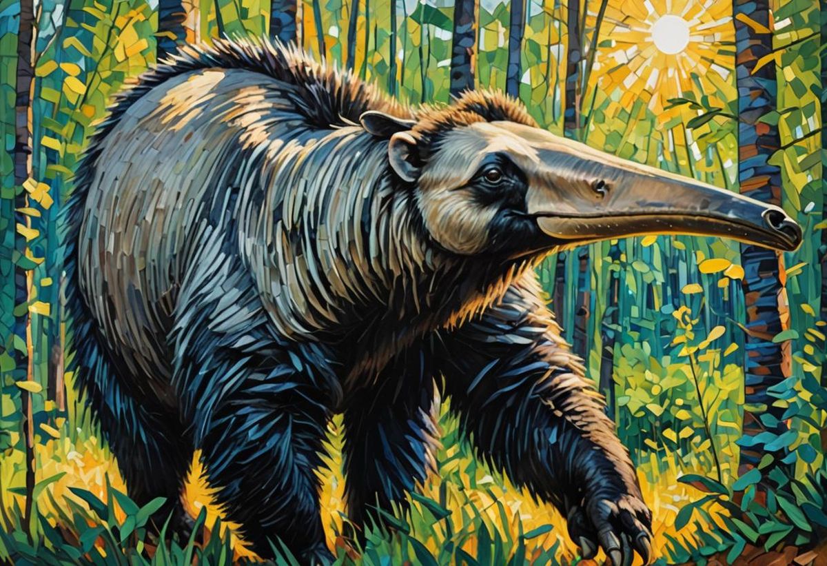 A vibrant neo-impressionist painting features a giant anteater in a sunlit forest. The artwork displays impasto techniques, thick brushstrokes, and a vivid color palette of blues, greens and gold.