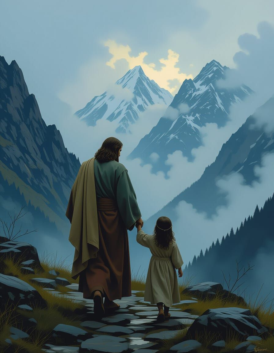 This image shows Jesus in humble robes walking through misty mountains, guiding a little girl. Rendered with rich colors and intricate detail, it evokes a fantastical, atmospheric style.