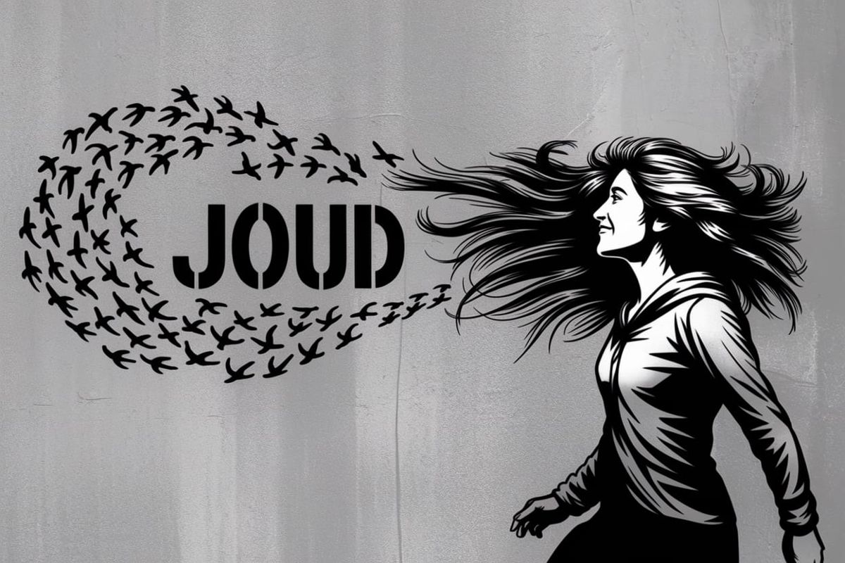 This striking image showcases stencil graffiti art featuring a Palestinian woman in a powerful wind, visualized with swirling birds. The word 'Joud' is integrated, symbolizing the embrace of freedom and determination.