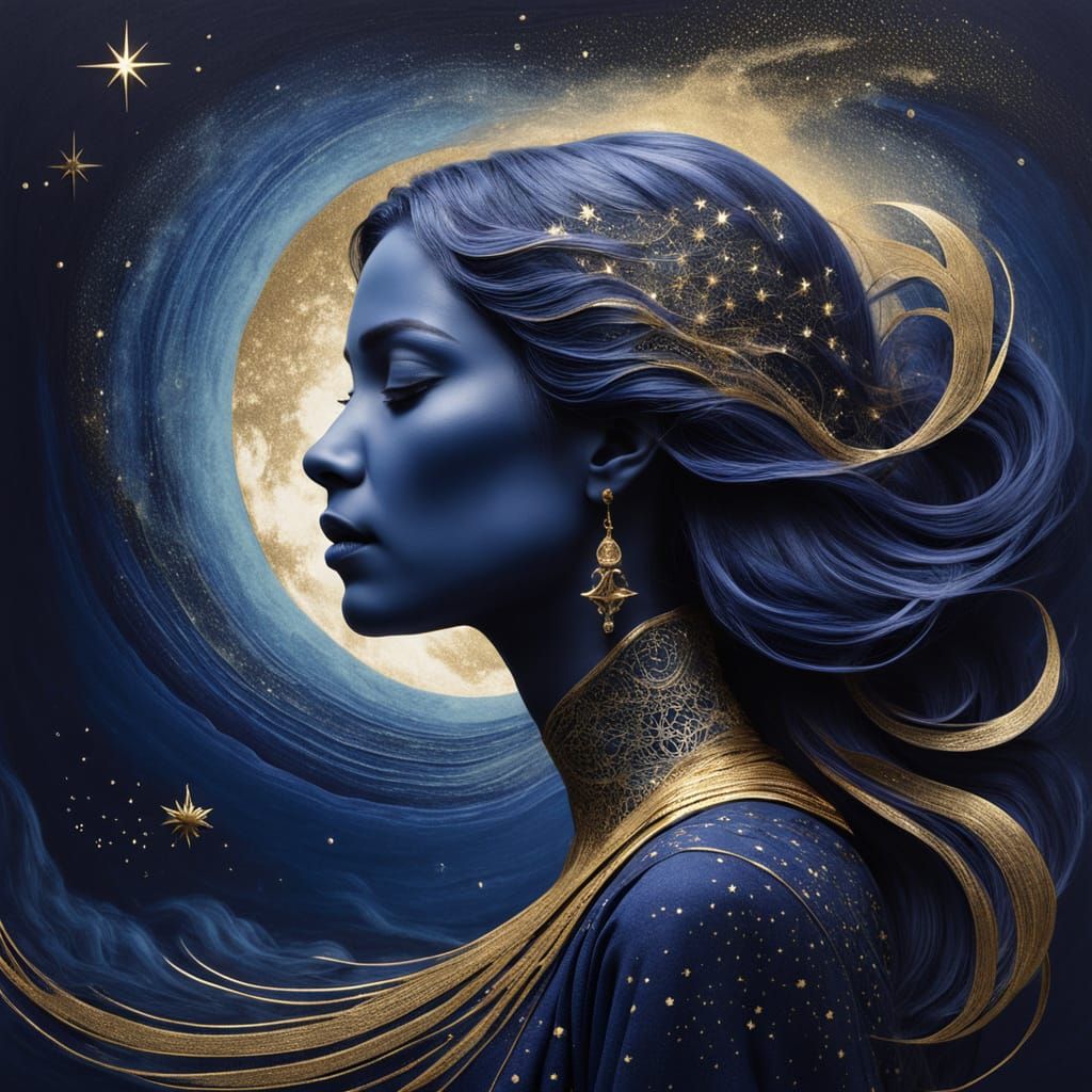 This image displays a dreamy, surreal portrait of a woman's profile layered with ocean and stars. Indigo and gold pigments create an ethereal glow in mixed media art.