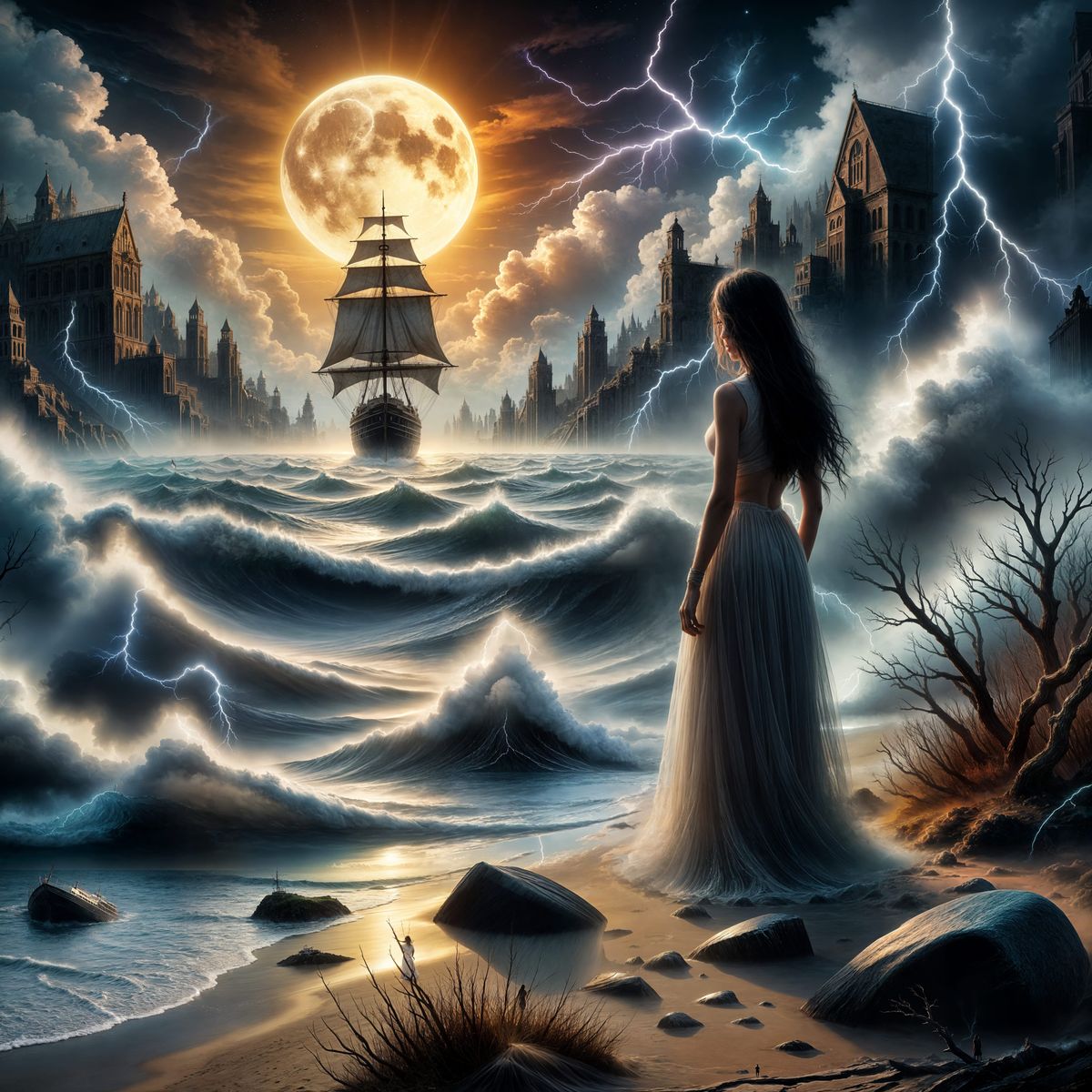 This image depicts a solitary woman on a windswept shore, watching a spectral ghost ship on a turbulent sea under stormy skies. Neon lightning illuminates the scene with eerie blue light, creating a dark, surreal atmosphere.