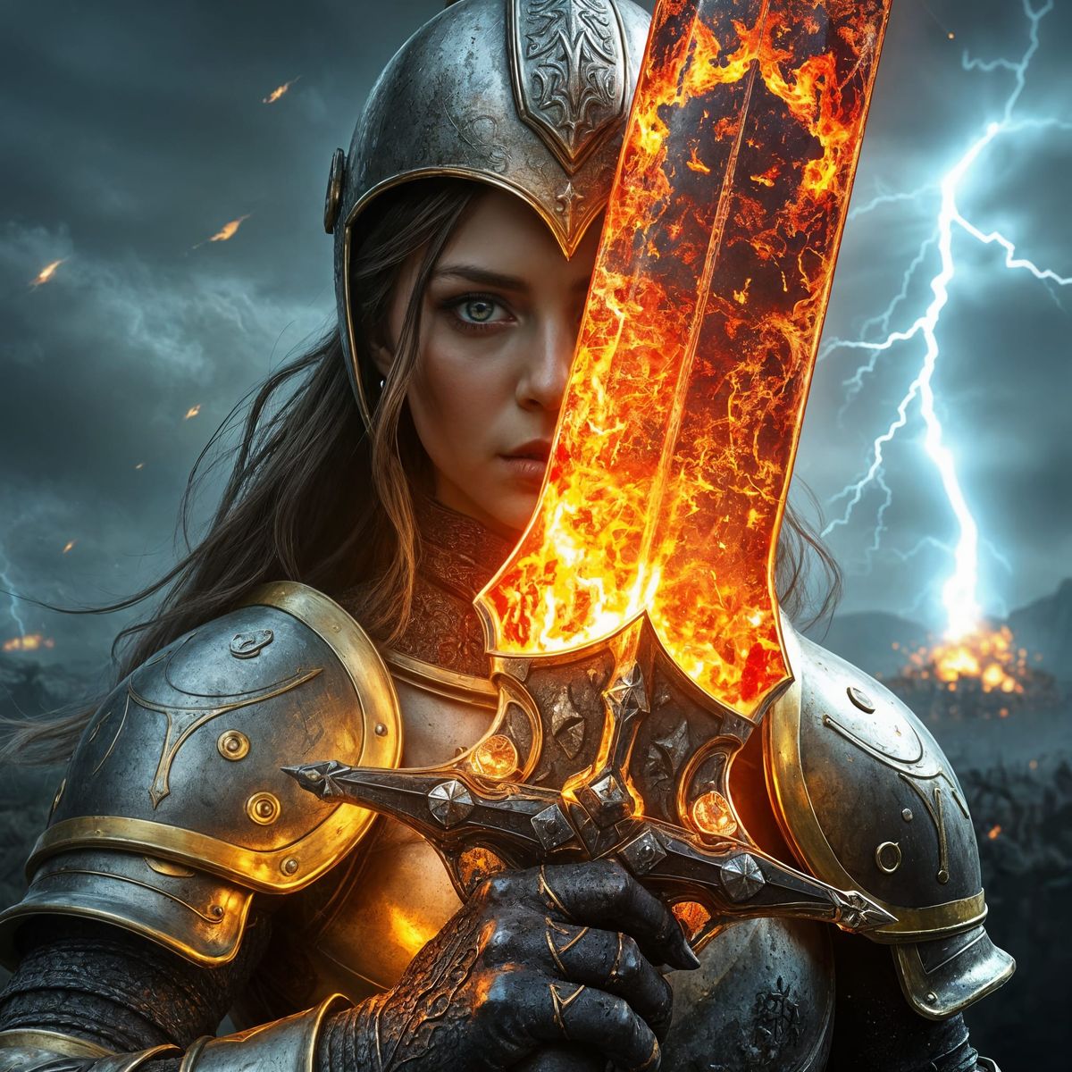 #female-knight#elemental-swords-dc#obscured-face#fiery#battlefield