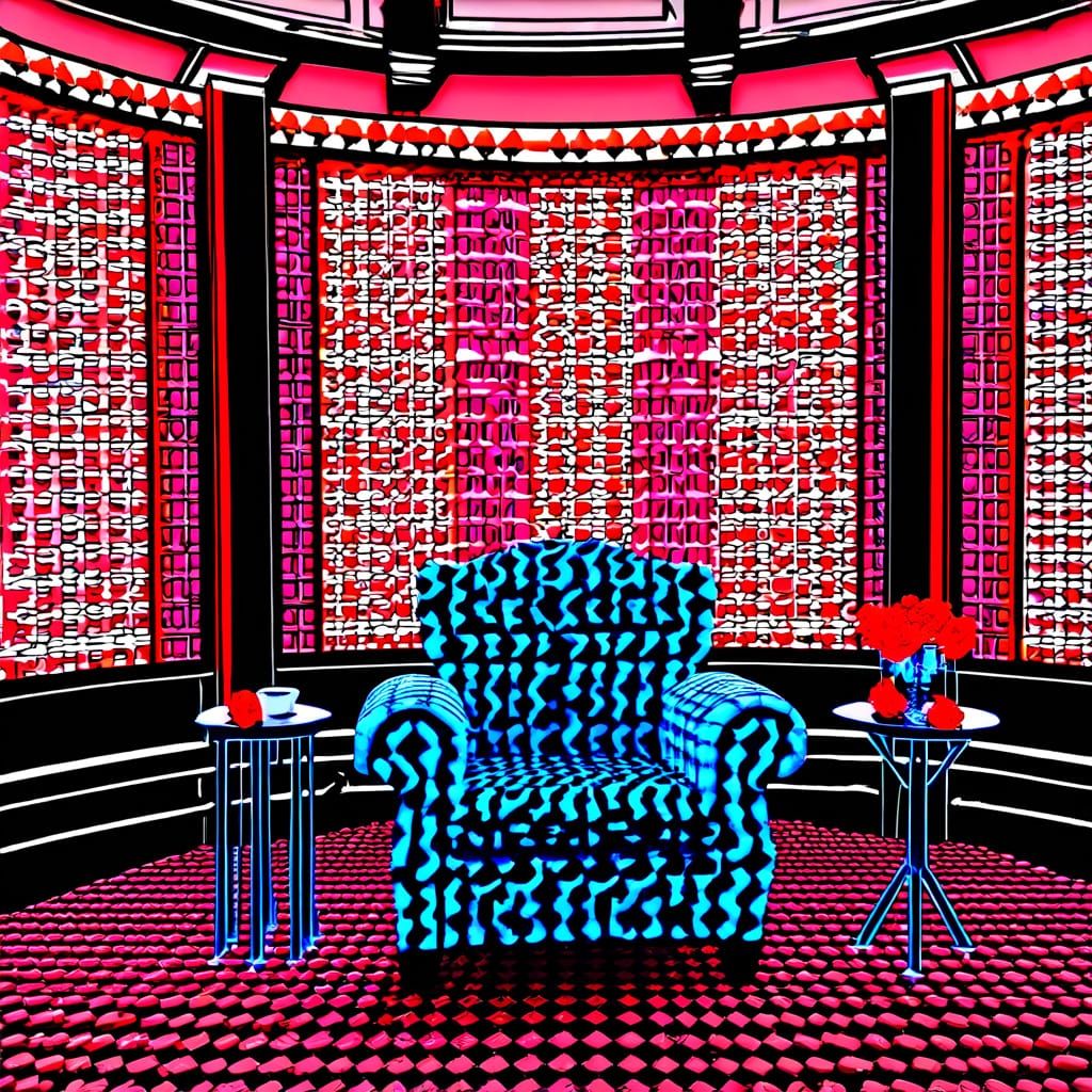 This image shows a woman in a cyberpunk city, seated on a cow print chair amidst red roses. It features a striking red and black color scheme with neon, futuristic elements and cinematic lighting.