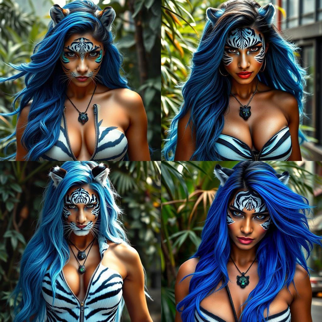A striking image of a woman embodying the Marvel White Tiger. The woman's face is adorned with glowing white tiger stripes. She wears a sleek outfit, with a black tiger pendant on her neck.