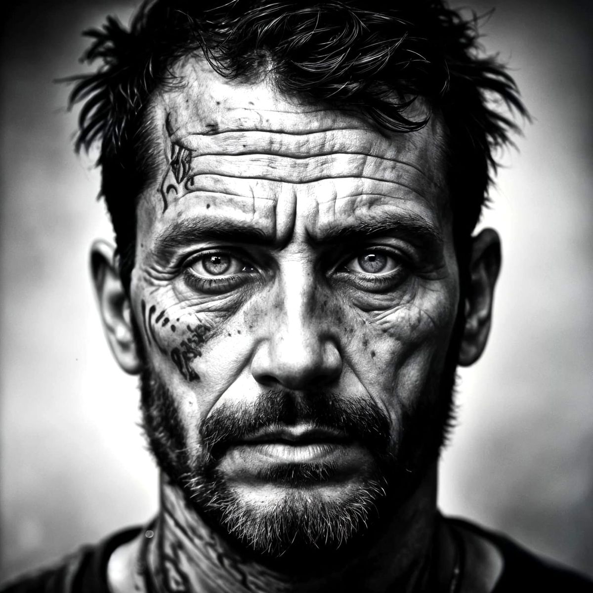 This image showcases a highly detailed, realistic close-up portrait of a calm, wise-looking 40-year-old man with tattoos. It features cinematic lighting and realistic textures.