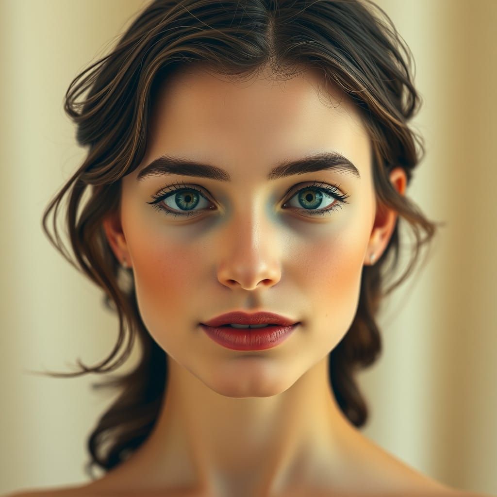 This portrait captures the dreamy essence of a young woman with striking green eyes, set against a soft, creamy background, blending realistic detail with expressive, painterly qualities.