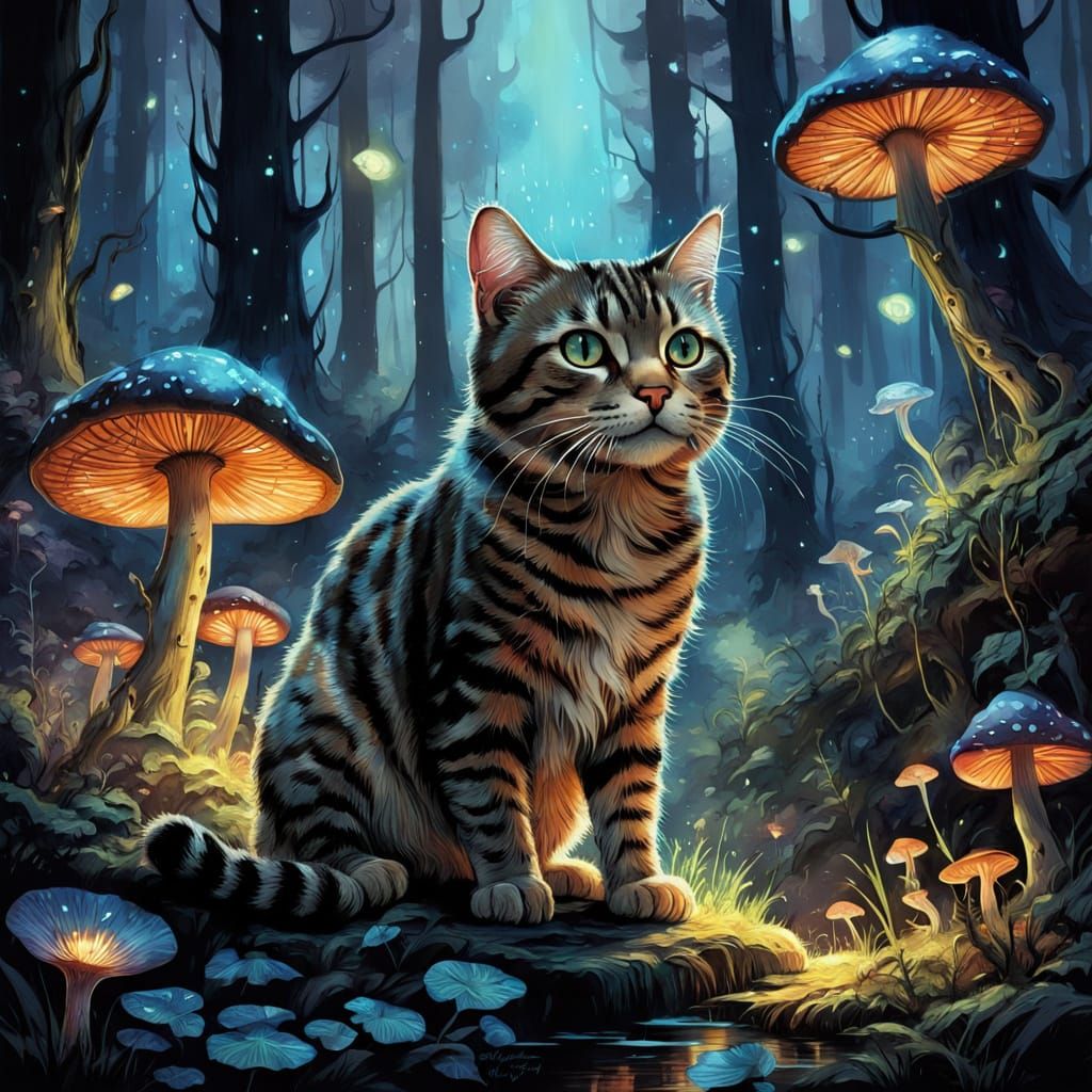 This enchanting watercolor illustration features a curious tabby cat exploring a mystical, glowing forest, surrounded by towering mushrooms and dancing fireflies, set amidst a soft, misty atmosphere with intricate details and a perfect blend of realism and fantasy.