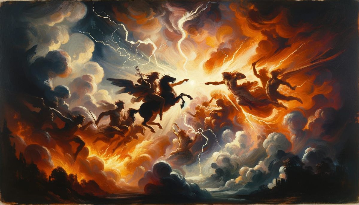 A dramatic image shows lightning illuminating fire silhouettes against a dark sky, reminiscent of late 19th-century European art. The oil painting style evokes a powerful, symbolic dialogue between light and darkness.