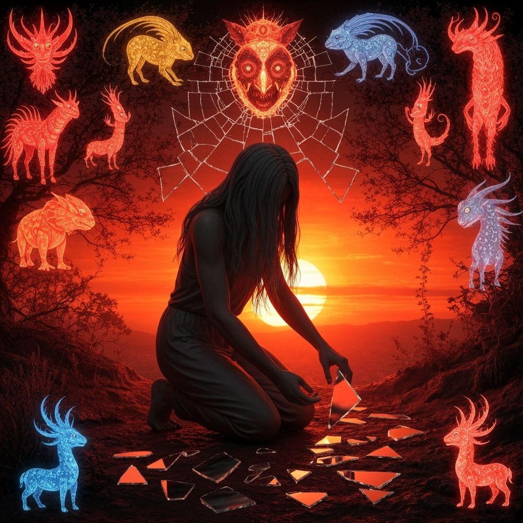 A surreal sculpture of a figure with long hair kneeling during sunset. The figure gathers pieces of broken mirrors amid a fire-red glow. The bio art collage features glowing mythological creatures.