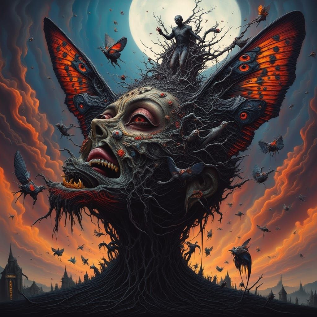 This image depicts a muscular man, a mutation of human and peacock, emerging from a fractal-faced figure in a surreal sky. It's a detailed concept art piece with intense, vivid imagery.