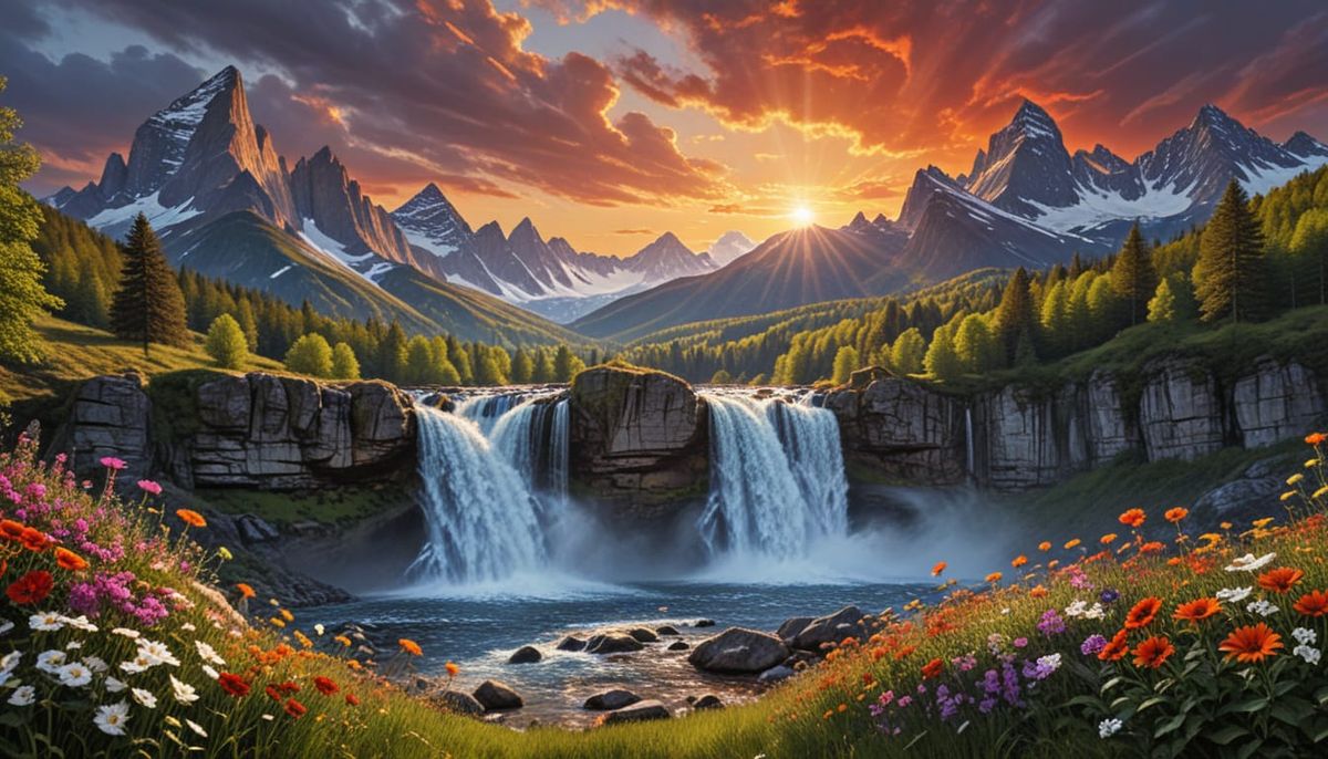 This image shows a painter in a large studio surrounded by art supplies, preparing to create a breathtaking mountain landscape with a waterfall, trees, and a majestic mountain range, set against a backdrop of dark clouds and a sunset.