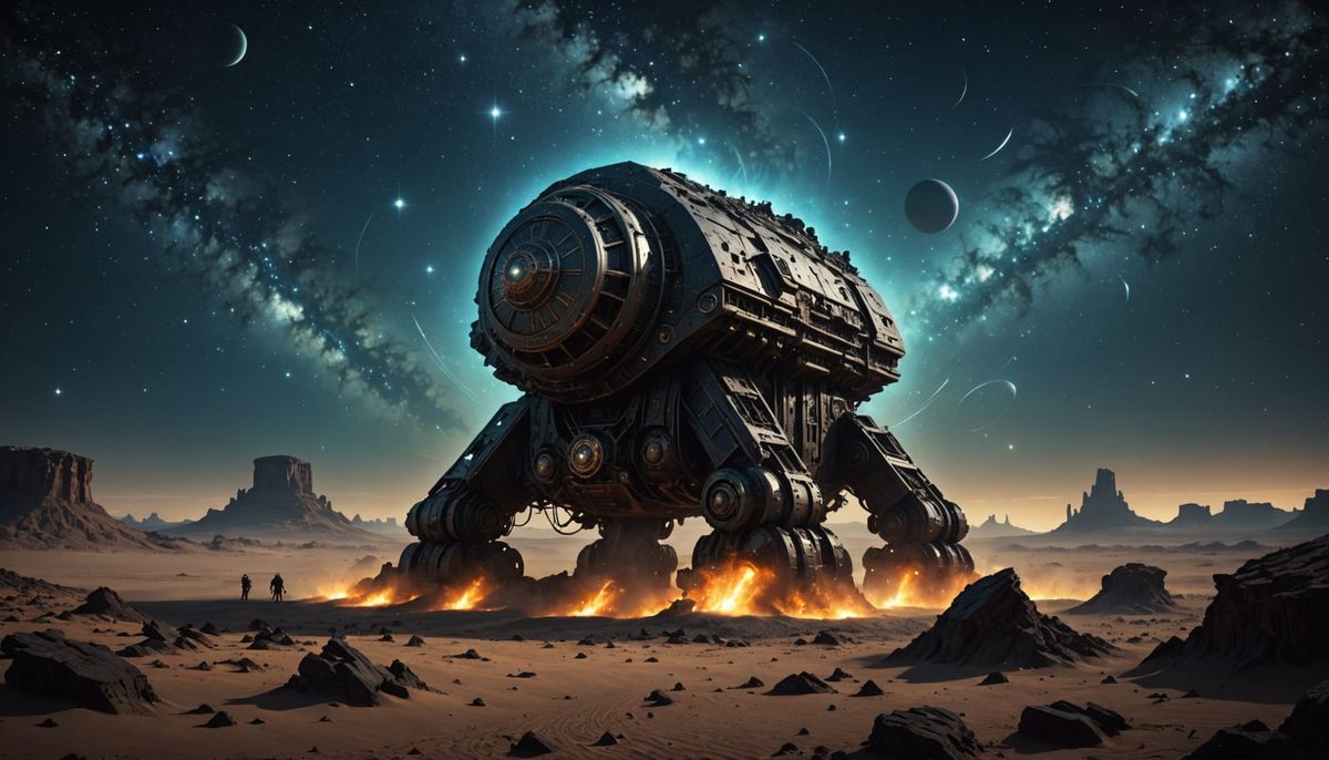 A colossal, ancient engine rests half-buried in cosmic sands under a swirling, star-filled sky. Its surface bears forgotten glyphs, glowing with eerie light. Concept art in a dark noir aesthetic.