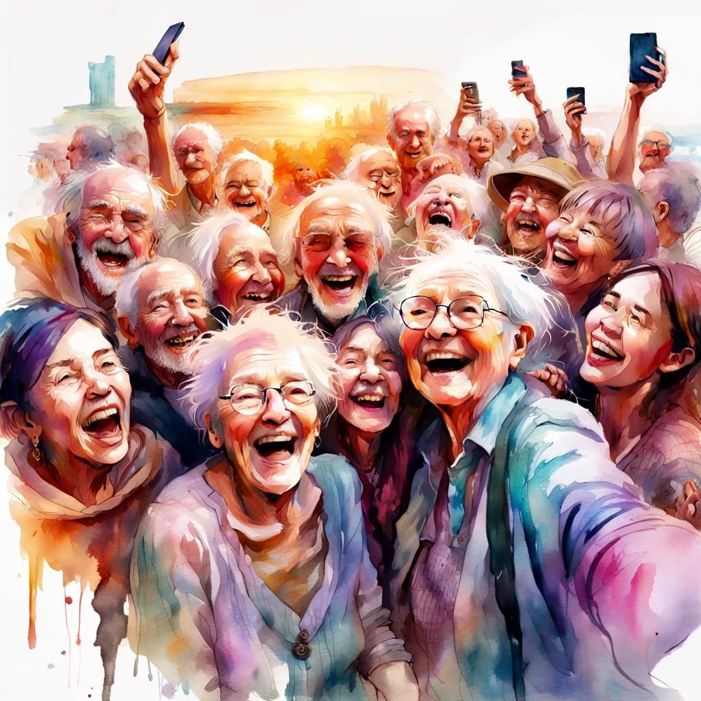 A vibrant digital watercolor illustration of a crowd of elderly people joyfully taking a selfie at sunset. The artwork features intricate details, soft lighting, and a pastel color palette.