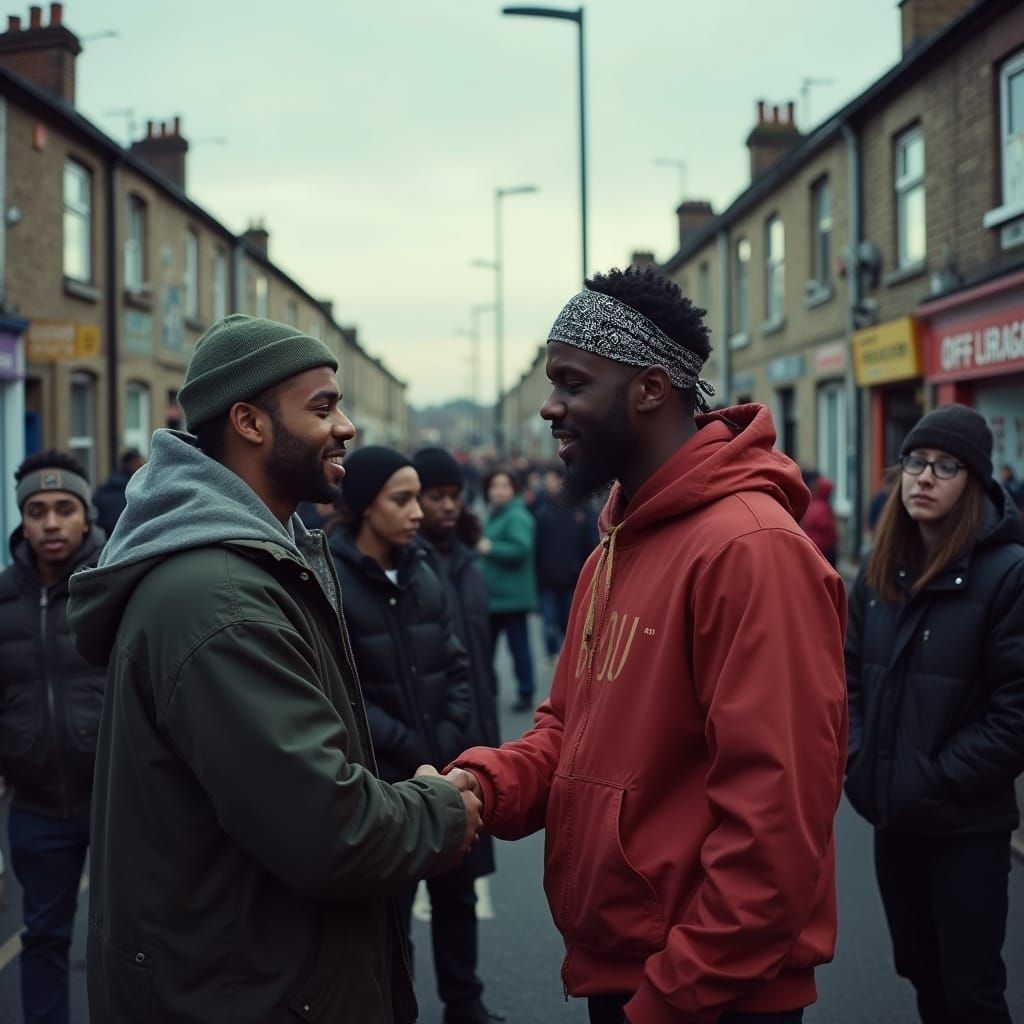 A cinematic image of a UK rap artist in a bandana shaking hands with a friend in a London estate. The shot, reminiscent of 35mm film, features film grain and color grading, creating an atmospheric scene.