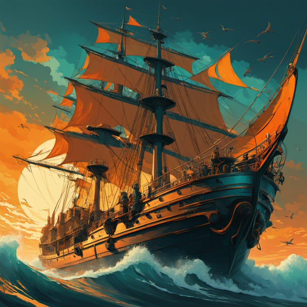 This image shows a person sailing on the sea in a small vessel. The portrait shot is rendered in vibrant oils with expressive brushstrokes under golden light. The piece has a cinematic, anime-inspired, fantasy art style.