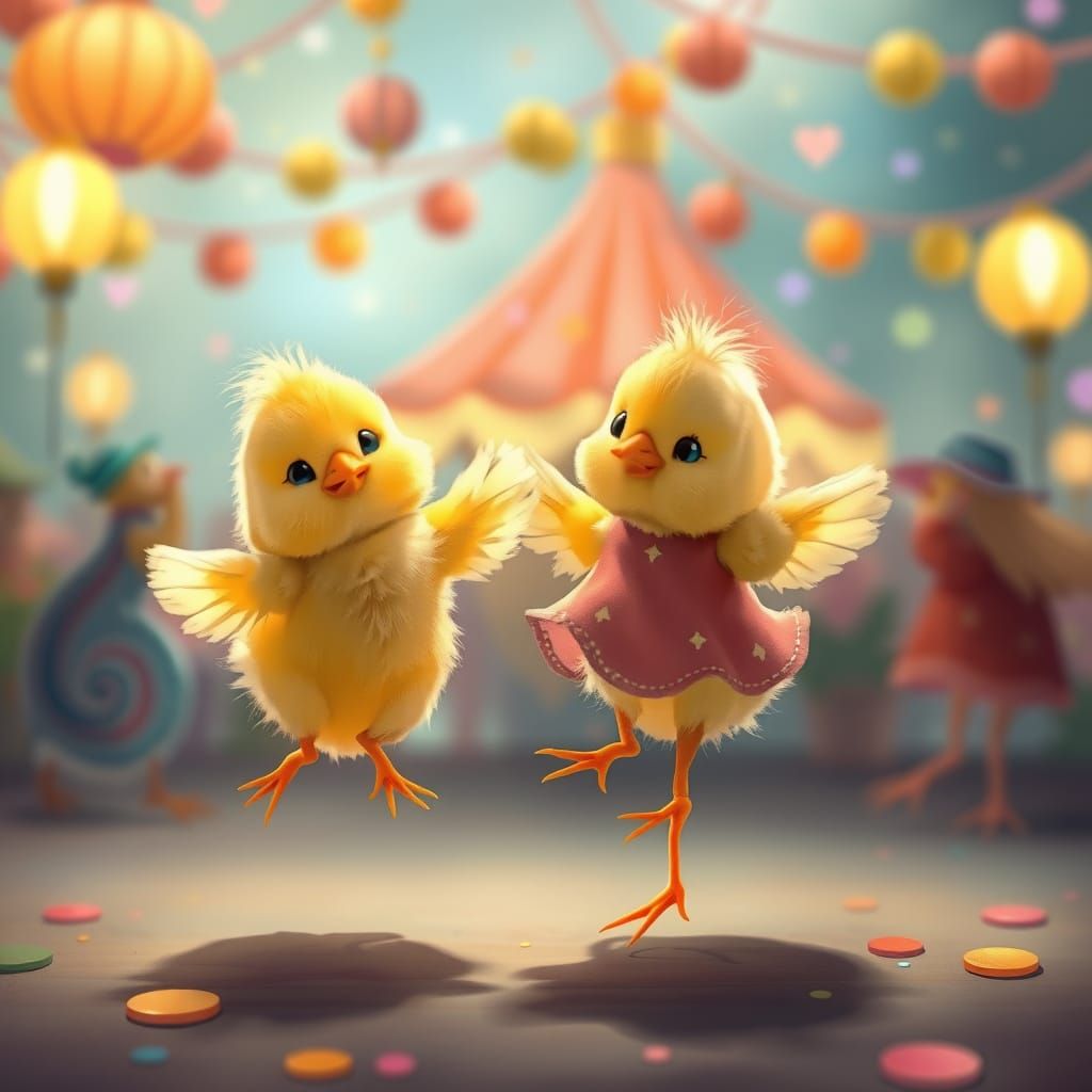 This image shows adorable chicks dancing in a colorful and playful environment. The artwork features soft textures and brushstrokes in a whimsical, animated style.