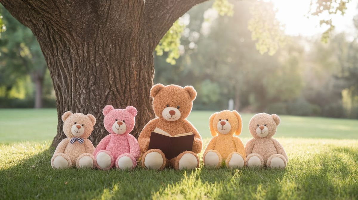 This image shows a heartwarming scene of a teddy bear surrounded by his stuffed friends, reading a book under the shade of a big oak tree on a sunny day.