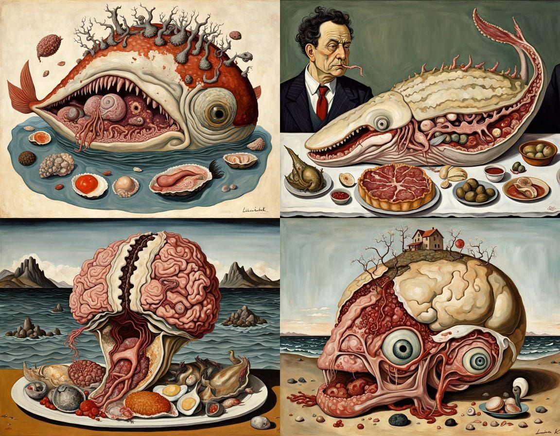 A bizarre, surreal horror image featuring a grotesque hybrid creature composed of whale parts and sea life. The scene evokes a sense of dread and anatomical horror in the style of oil painting.