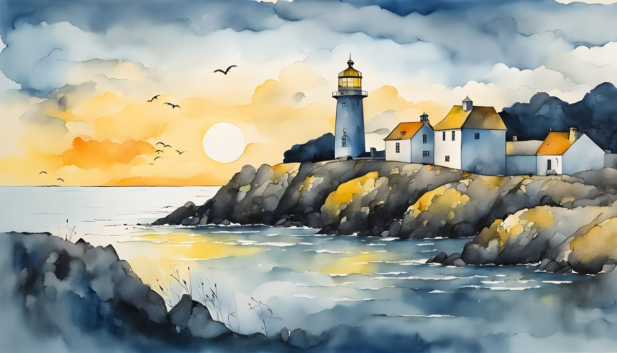 This image shows a charming old hamlet and lighthouse perched on a cliff by the sea at sunset. Rendered in complementary colors with fine details, it features a watercolor aesthetic.