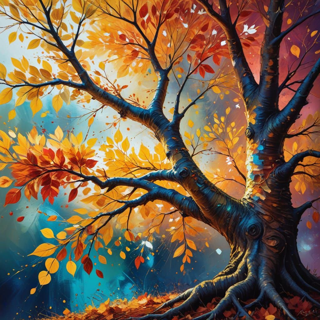 A close-up concept art image of a vibrant, multicolored tree of life. The detailed trunk and iridescent leaves are illuminated by golden light, creating a fantastical, abstract explosion of color.