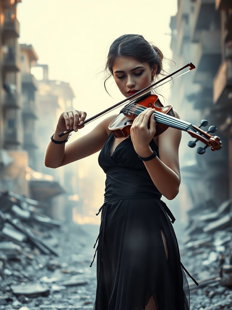This image shows a young woman in a black dress playing a violin in a ruined city. Dust and ash swirl around her, with collapsed buildings in the background. The cinematic composition captures emotion, decay, and resilience.