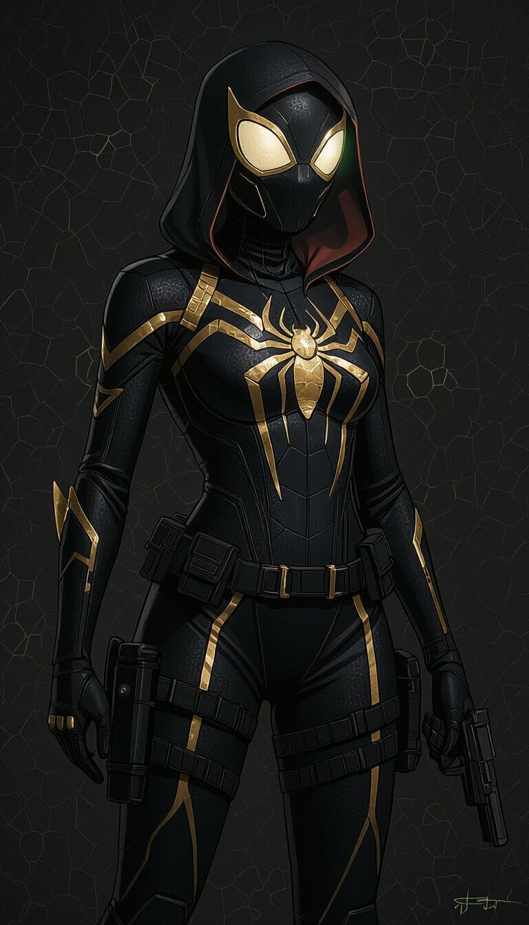 This image features a woman in a sleek black and gold suit with Spider-Gwen style hood, emerald eyes, and beetle-inspired armor. The art style evokes a retro-futuristic feel with detailed plating and gold accents.