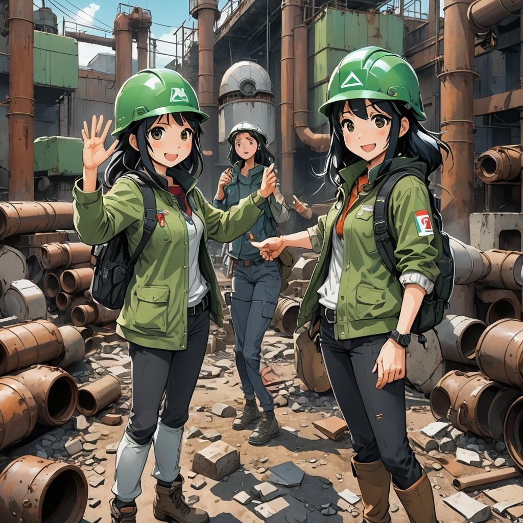 This image shows two smiling Italian female geologists in work clothes giving each other a high-five in a derelict industrial area. The image is cel-shaded with cinematic lighting.