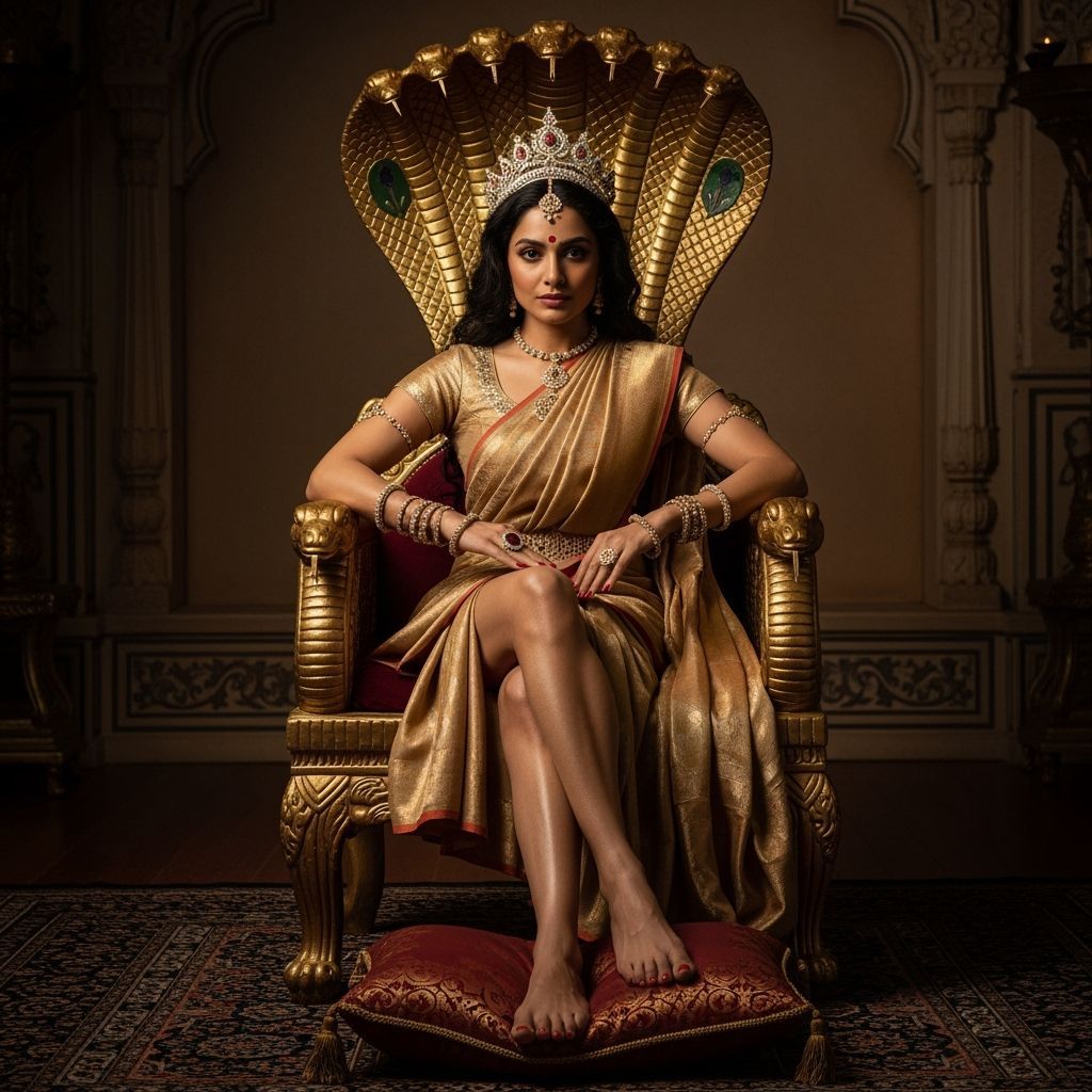 A striking picture of an Indian Maharani seated on a cobra throne. She is lavishly adorned in gold, with her bare feet resting on silk. The image showcases a photorealistic style with natural lighting.