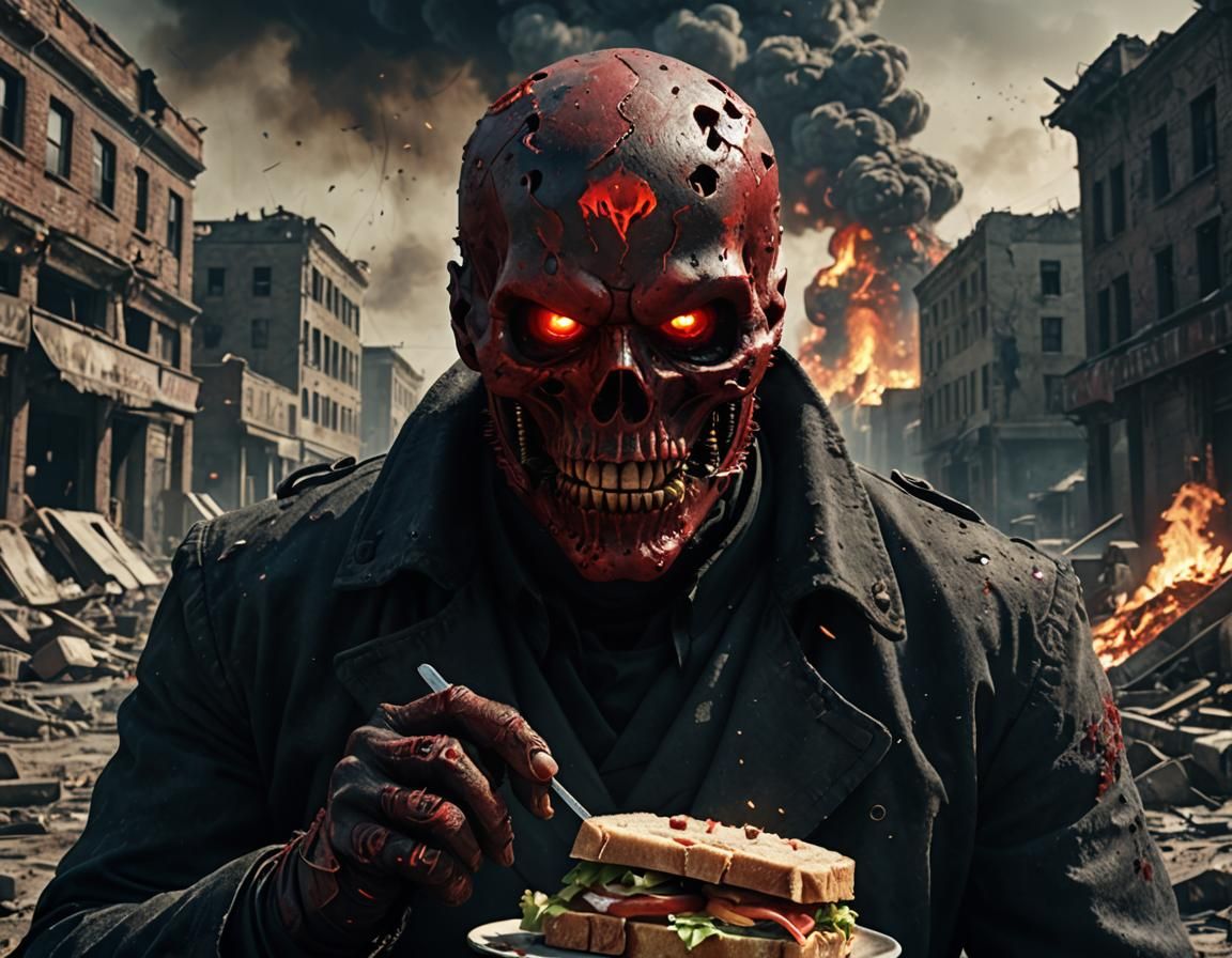 This image shows a close-up of the Red Skull eating a sandwich amidst the ruins of a war-torn city. The digital art uses gritty textures and dramatic lighting to create a menacing atmosphere.