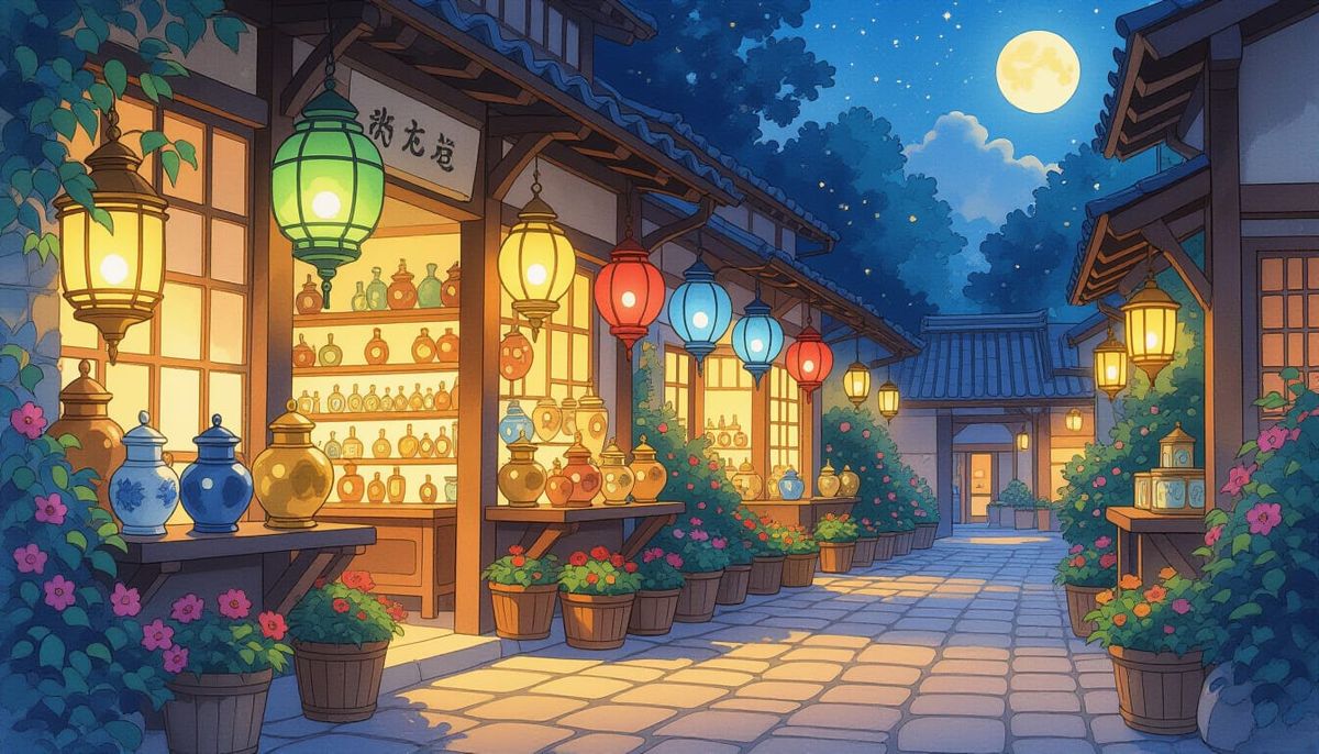 "Watercolor painting. Medium shot. A lantern shop filled with bronze, silver, copper, and gold lanterns. Close up. Whimsical floral watercol...