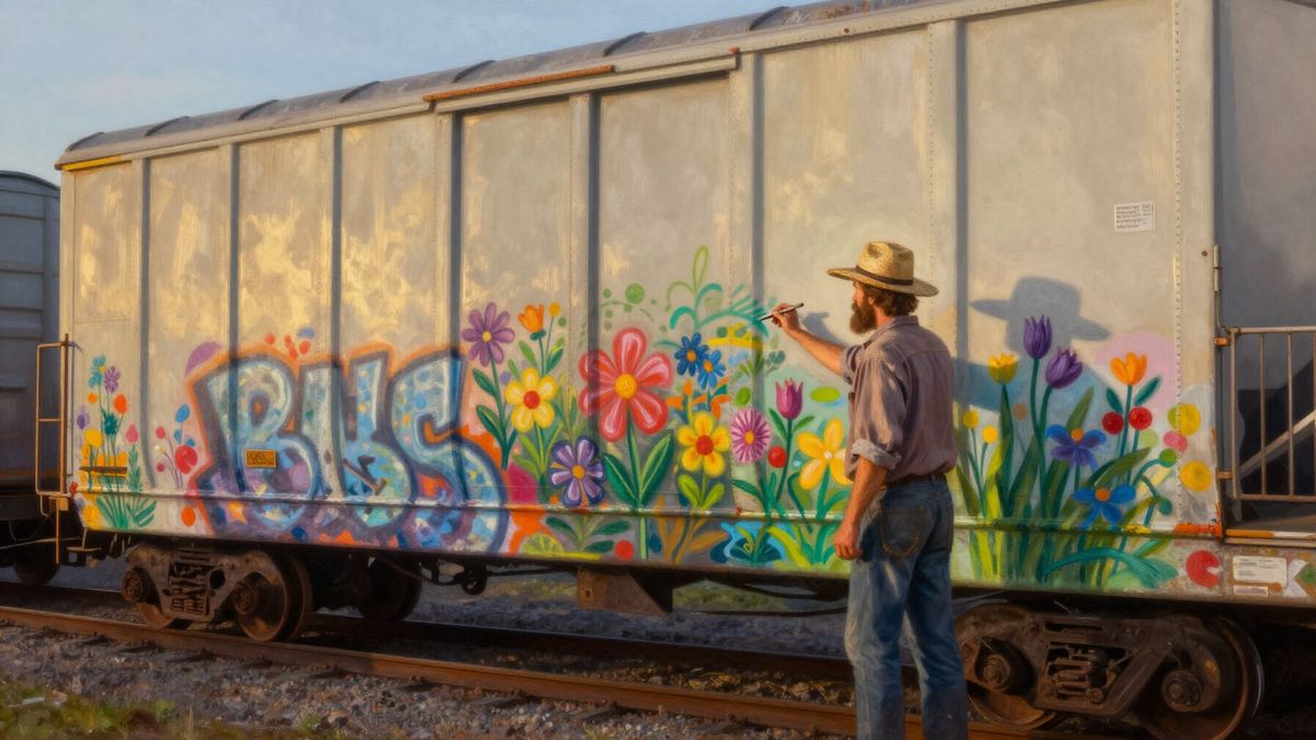 This oil painting shows an Amish man creating vibrant graffiti art on a freight train at dusk, in a style reminiscent of Norman Rockwell. The scene conveys peaceful rebellion and artistic expression.
