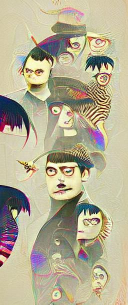 This image shows a chibi-style rendering of the virtual band Gorillaz in a Victorian Goth aesthetic. The image is reminiscent of Genndy Tartakovsky's style with elements of Kandinsky and Junji Ito.