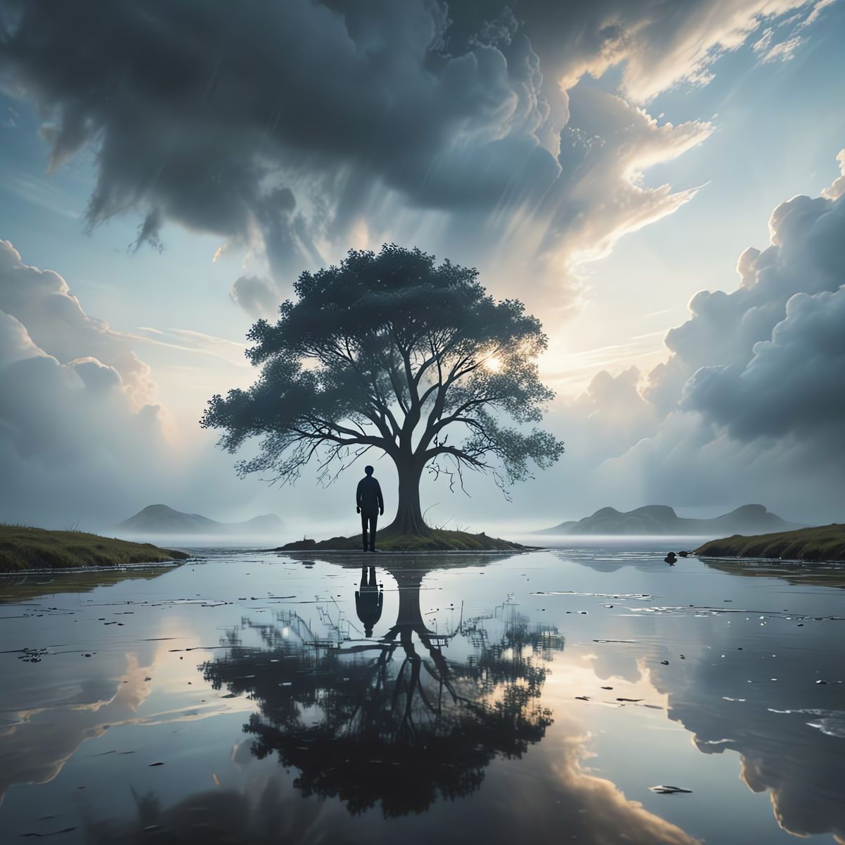 A solitary figure stands on a shallow reflective surface under a pale morning sky, surrounded by concentric ripples caused by gentle rainfall, with a large cumulus cloud mirrored below and slightly blurred by the water’s motion, while the figure’s silhouette remains sharp against the soft blue haze of ...