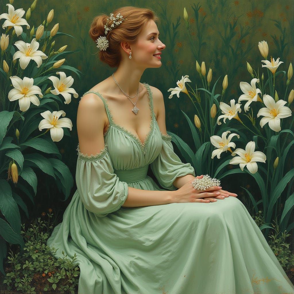 A beautiful, smiling woman in a lush green gown sits amidst a shaded garden path surrounded by lily of the valley, with a basket of valley lilies by her side, captured in a soft, pastel light style reminiscent of Impressionist masters.