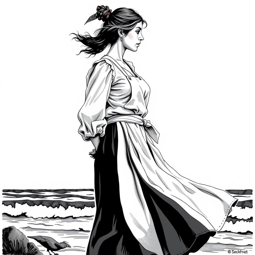 This image shows a woman standing tall with a relaxed posture, her body accentuated by fitted clothing and flowing fabrics, evoking a sense of rustic charm and nostalgia in a dramatic, high-contrast style reminiscent of 19th century folk art.